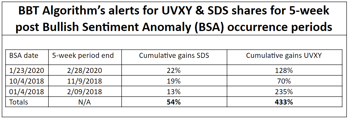 • Double leveraged UVXY shares significantly outperformed S&P 500’s double leveraged SDS inverse ETF shares for the three prior BSA 5-week post anomaly periods even though both utilized same BBT algorithm powered Bull & Bear Tracker and Bear Trader short alerts.