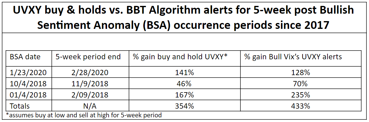 • Utilize BBT algorithm’s short signals, which have powered Bull & Bear Tracker and Bear Trader index inverse ETF alerts since 2018, to send alerts to trade VIX related VXX and UVXY shares and call options for the VXX, UVXY and VIX index.  Due to increases in volatility for the five weeks following BSA occurrences being highly probable the conditions for deploying call option strategies for returns of 1,000% or more in five weeks or less are ideal.
