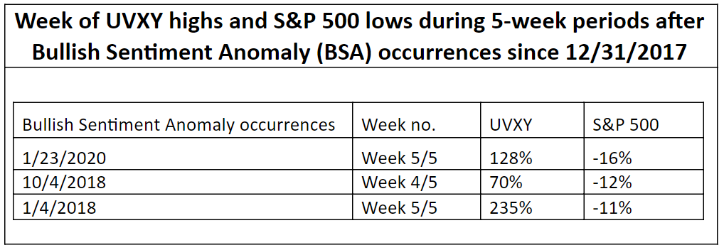 The table also depicts that two of the three highs for the UVXY and lows for the S&P 500 occurred in the fifth week after the last three BSA occurrences.  The high week for the UVXY and the low week for the S&P 500 for the lone remaining 5-week period occurred four weeks after the October 4, 2018 BSA occurrance.